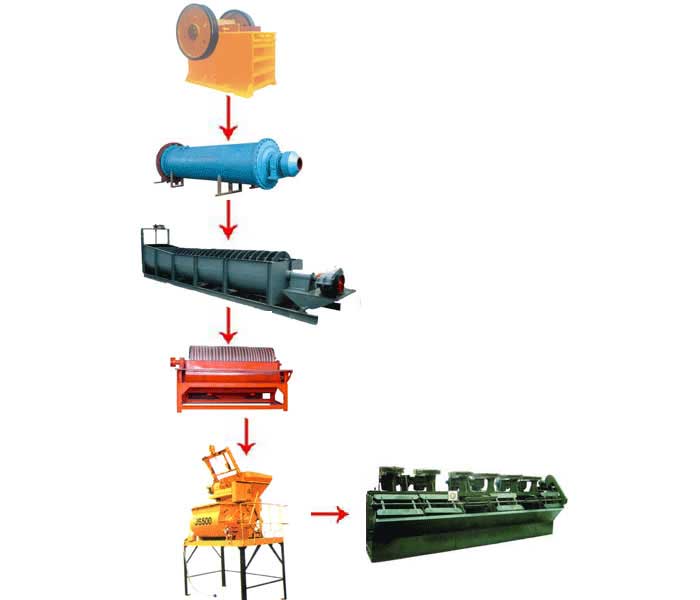 浮選機:對礦漿進行充氣攪拌,使表面已受捕收劑作用的礦粒向氣泡附著,用刮板刮出,得到精礦。
